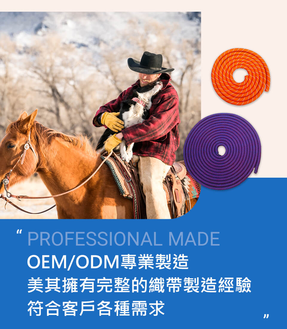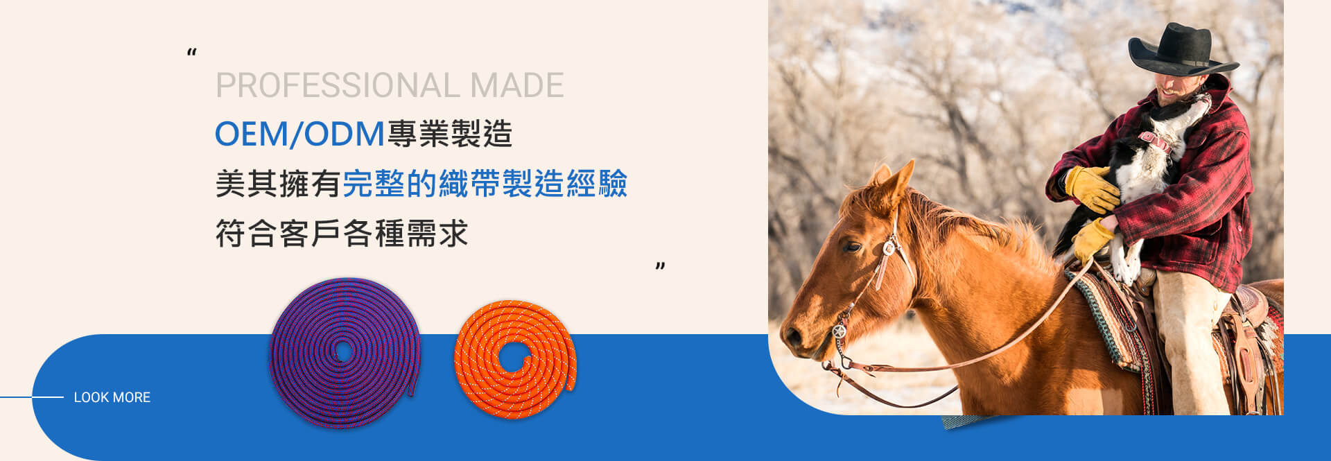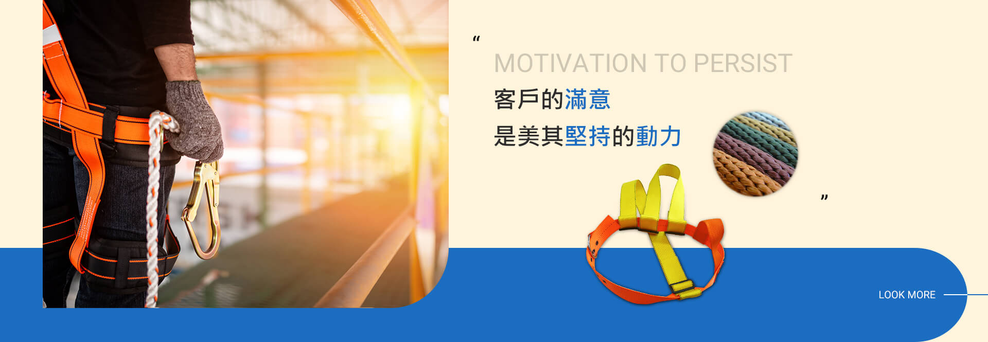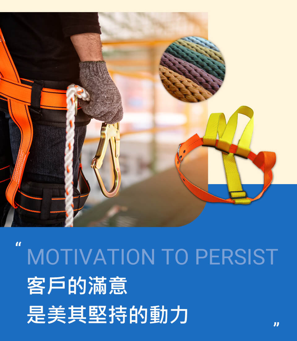 美其織帶創立於西元1975年,擁有40年以上各類織帶的製作經驗。從牽紗、織造到染整加工,皆有可令人信服的技術,提供客戶完整的解決方案。可依據不同的纖維材質客製各種類型、功能、拉力、顏色的織帶,可用於工業拖吊帶、寵物拉繩、安全帶、鬆緊帶等…。